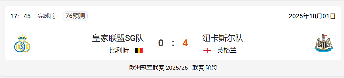 newbb官网 2025年10月01日皇家联盟SG队纽卡斯尔队:足球比赛概述与实时更新 皇家联盟SG队 (比利時) 与 纽卡斯尔队 (英格兰) 之间的足球比赛于星期三 2025年10月01日 在 17:45 结束,比分为4 : 0,有利于 纽卡斯尔队。这场比赛是 联赛 阶段 的一部分欧洲冠军联赛 2025/26。 由于比赛已经结束,因此皇家联盟SG队对阵纽卡斯尔队的投注已不再接受和可用。