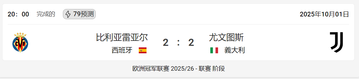 newbb官网 2025年10月01日比利亚雷亚尔尤文图斯:足球比赛概述与实时更新 联赛 阶段 欧洲冠军联赛 2025/26 中 比利亚雷亚尔 (西班牙) 和 尤文图斯 (義大利) 之间的足球比赛于 星期三 2025年10月01日 结束,时间为 20:00。比赛以 2 : 2 的比分打成平局。 由于比赛已经结束,因此比利亚雷亚尔对阵尤文图斯的投注已不再接受和可用。
