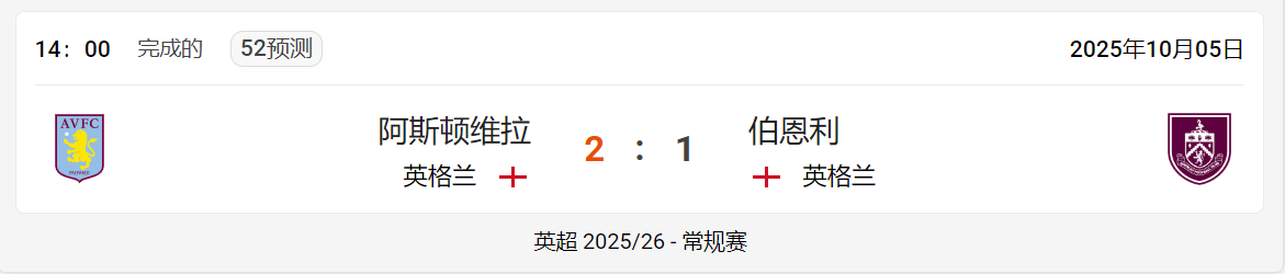 过了一遍以上 2025年10月05日阿斯顿维拉伯恩利:足球比赛概述与实时更新 阿斯顿维拉 (英格兰) 与 伯恩利 (英格兰) 之间的足球比赛于星期日 2025年10月05日 在 14:00 结束,比分为2 : 1,有利于 阿斯顿维拉。这场比赛是 常规赛 的一部分英超 2025/26。 由于比赛已经结束,因此阿斯顿维拉对阵伯恩利的投注已不再接受和可用。