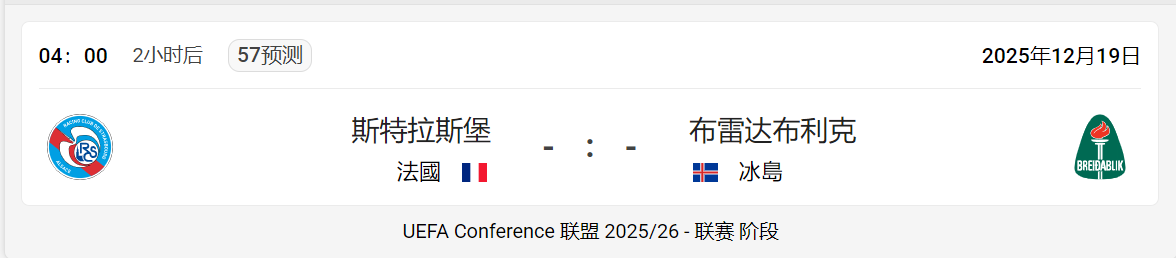 联赛 阶段阶段的UEFA Conference 联盟 2025/26即将开始,又将有一场足球比赛。斯特拉斯堡 (法國)对阵布雷达布利克 (冰島)定于星期五 2025年12月19日进行,所以记得在04:00调整频道。